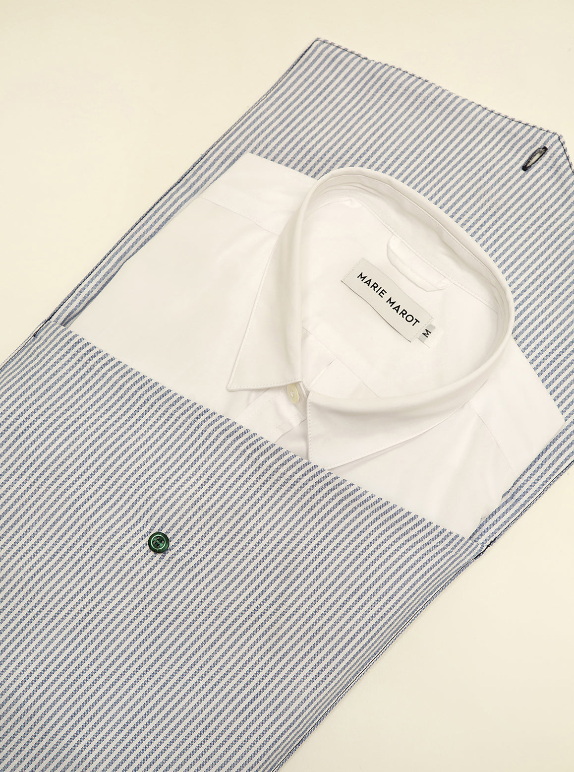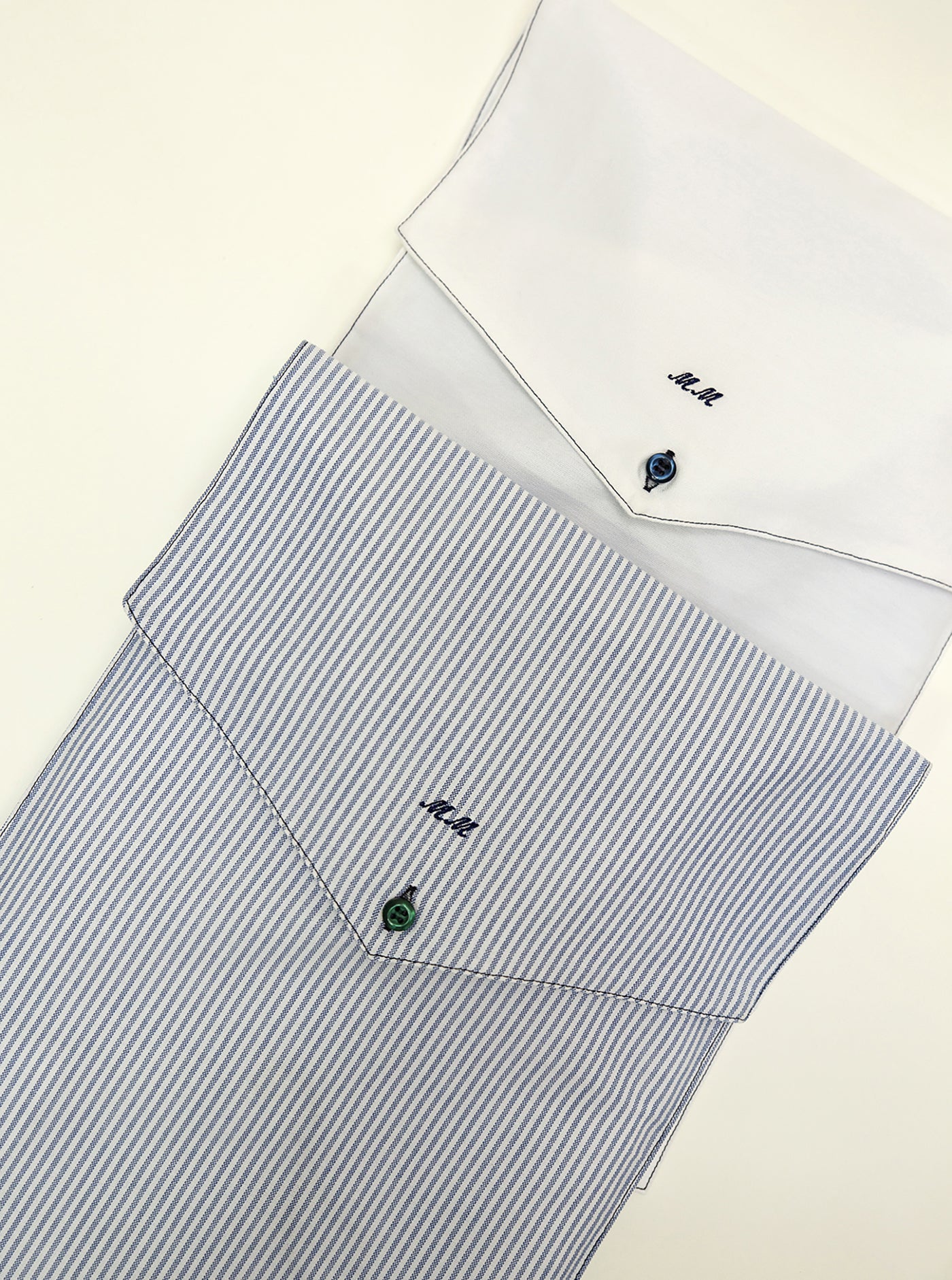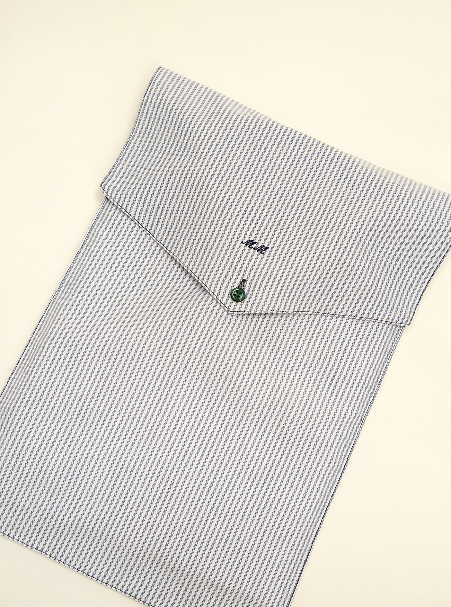 Blue & white striped pouch, perfect for slipping your shirts in with elegance. Ideal for gifting, traveling, or simply protecting your favorite pieces every day.