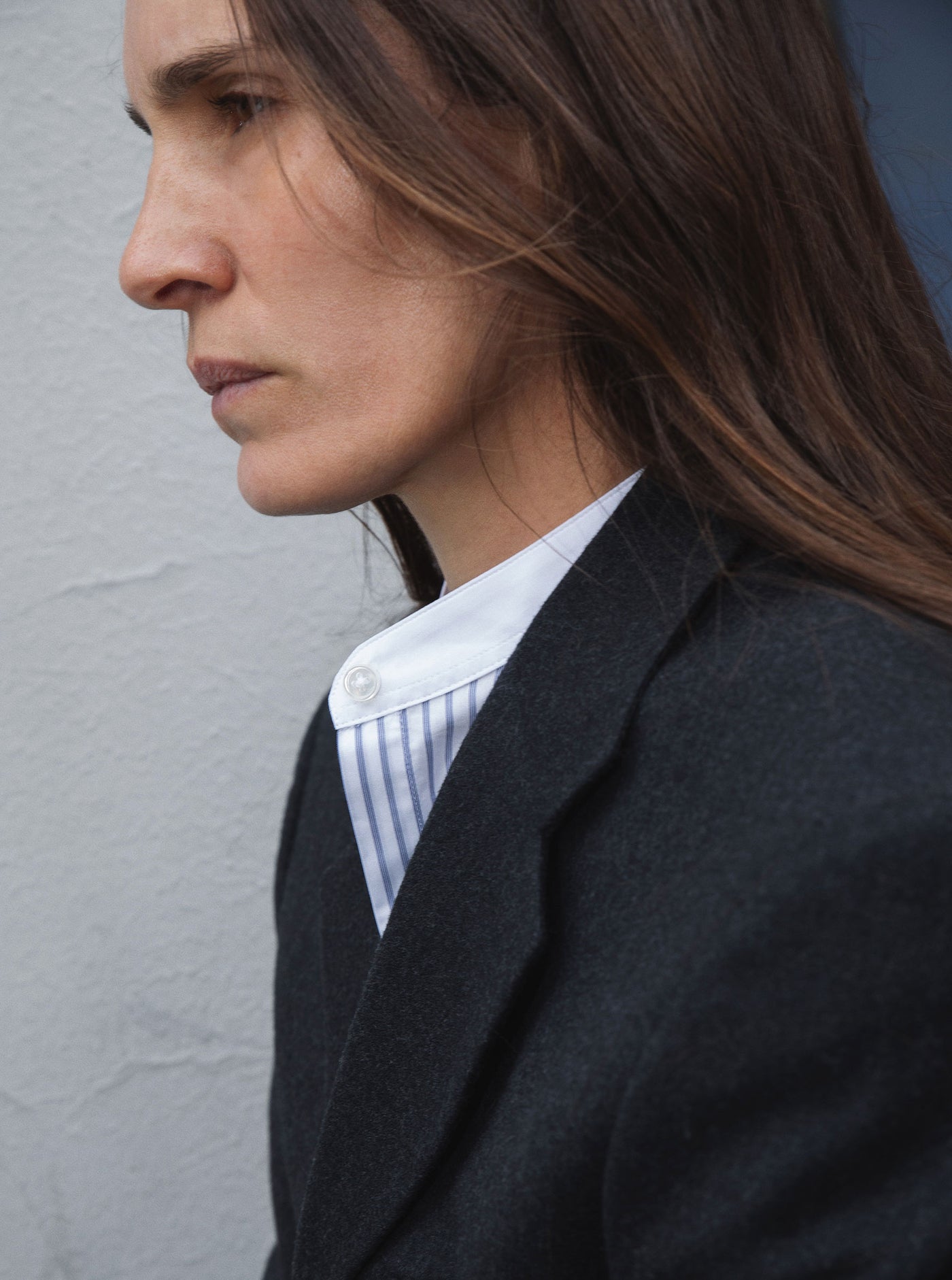 Its straight, slightly oversized cut offers a fluid, balanced silhouette. The officer collar enhances the neckline, while the back pleat ensures ease and movement.